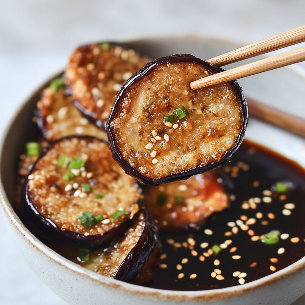 팬에 노릇 하게 부쳐진 가지전을 접시에 답고 간장소스를 부어서 완성합니다.